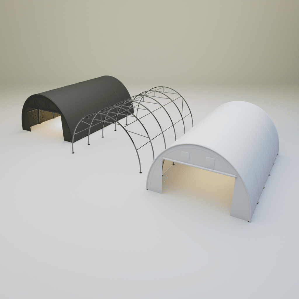 Nosná časť haly pozostáva z oceľovej konštrukcie s pozinkovanou úpravou, ktorá odoláva korózii a zaistí dlhodobú stabilitu. Tento typ konštrukcie spolu s oblúkovým tvarom zaisťuje, že hala vydrží aj náročné podmienky počas celého roka.