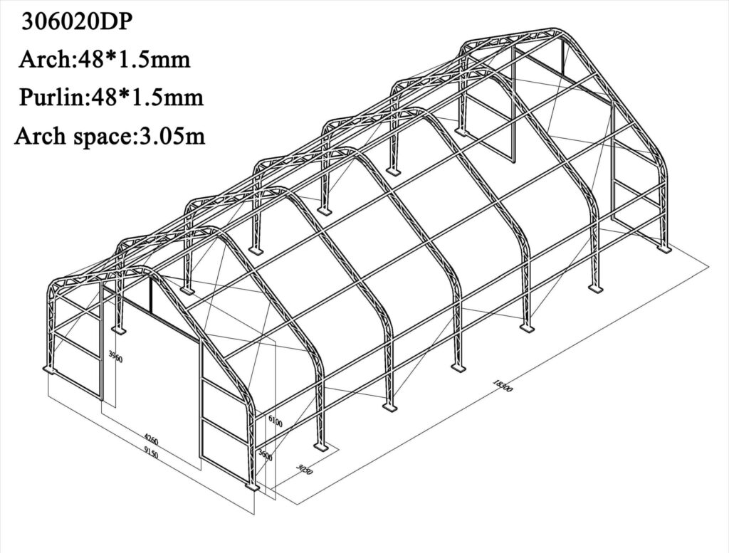 V prostredí, kde je odolnosť, flexibilita a dlhá životnosť absolútnou nevyhnutnosťou, prichádza sedlová hala s rozmermi 9,15 x 18,3 x 6,1 metra ako spoľahlivý a univerzálny partner. Či už potrebujete efektívne riešiť skladovanie materiálov, chrániť poľnohospodársku techniku, zabezpečiť priestor pre zvieratá alebo vytvoriť suchý a bezpečný priestor pre strojové vybavenie — táto hala spĺňa všetky požiadavky modernej prevádzky.
