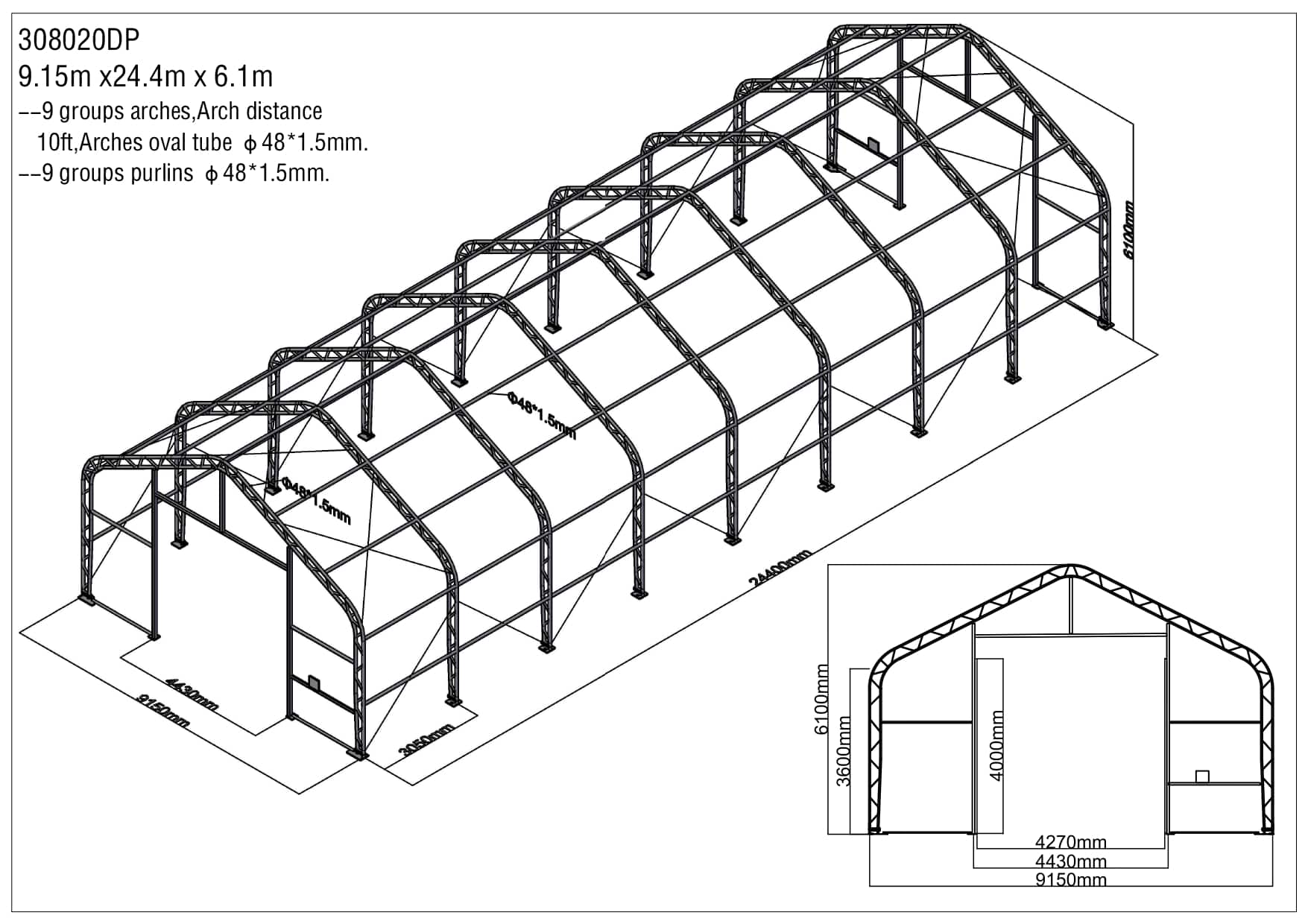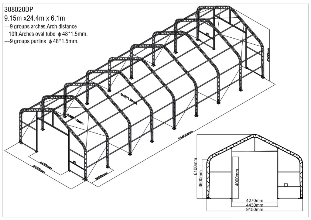 Rovná stena haly dosahuje výšku 3,6 metra, čo spolu s celkovou výškou konštrukcie 6,1 m poskytuje mimoriadne veľký vnútorný priestor. Navyše, dvere sú umiestnené na oboch koncových stenách a ich otváranie je riešené praktickým ručným navijakom, čo zvyšuje komfort pri každodennom používaní.