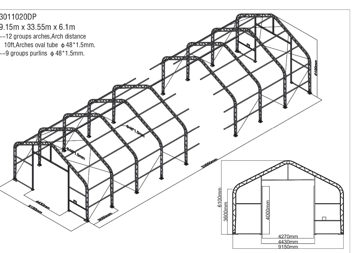 Główną konstrukcję hali tworzą pionowe stalowe łuki, które charakteryzują się najmocniejszą podwójną konstrukcją i są ze sobą połączone, dzięki czemu tworzą mocną i trwałą konstrukcję hali.